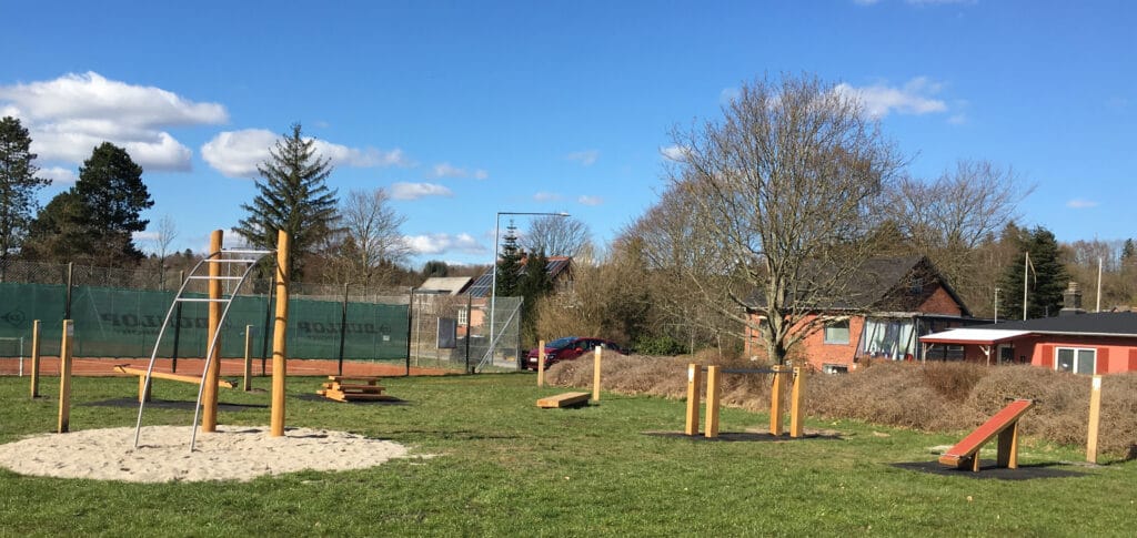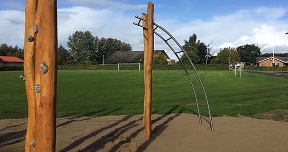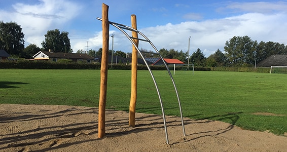 Ribbe i Rf rør med Rf stænger som greb og robiniestolper som støtte.