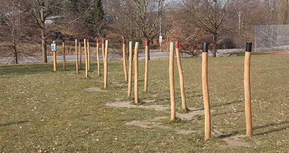 Slalombanen udføres med porte i robiniestolper Ø 8-10 cm. med farvet top.