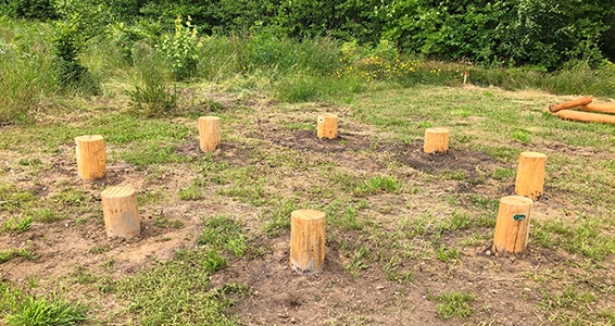 Redskabet “Trædestubbe” består af 8 robiniestolper Ø ml. 24-28 cm.