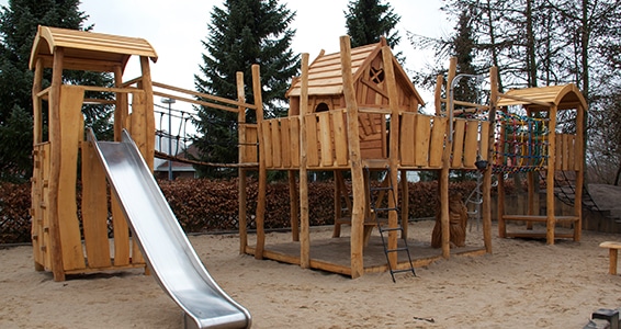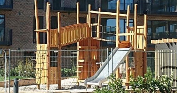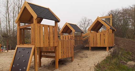 Legeborge til legepladsen med firkantede tårne som grundmoduler.
