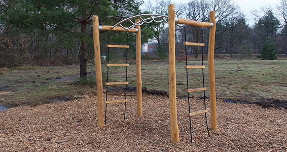 Armgangen udføres som to galger i afsplintede og pudsede robiniestammer monteret med buet ribbebro.