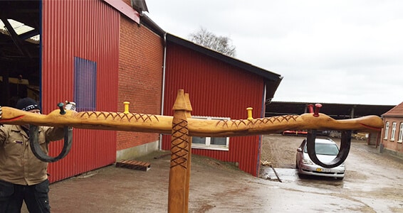 - Dekoreret med udskårne øgleskæl og farvede horn.